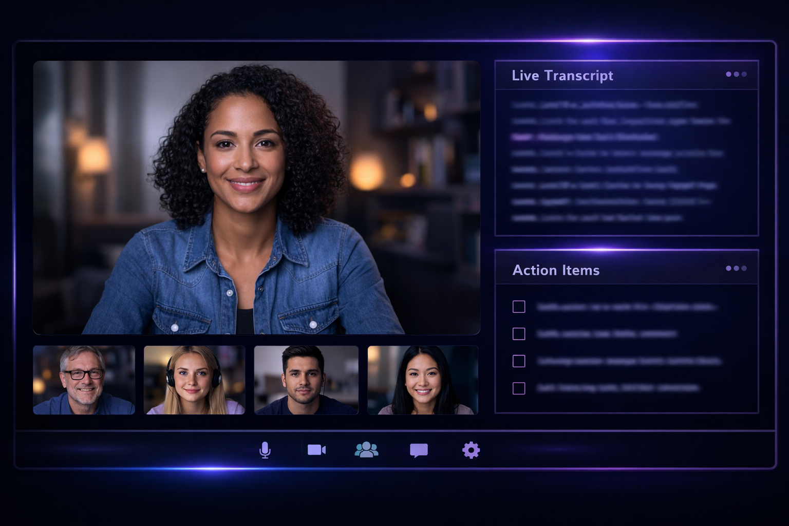 Virtual meeting interface with AI assistant panel showing transcript and action items